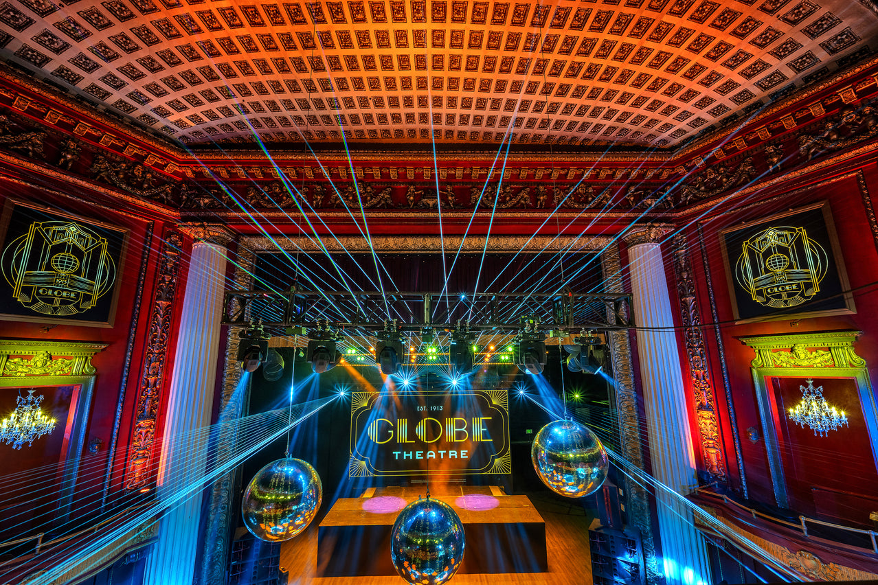 Globe Theatre main floor & Mezzanine/VIP Lounge are immersed in the beauty and elegance of the theatre’s original Beaux Arts decorative features.